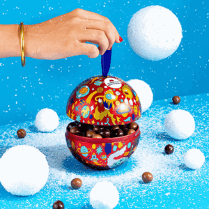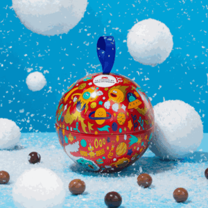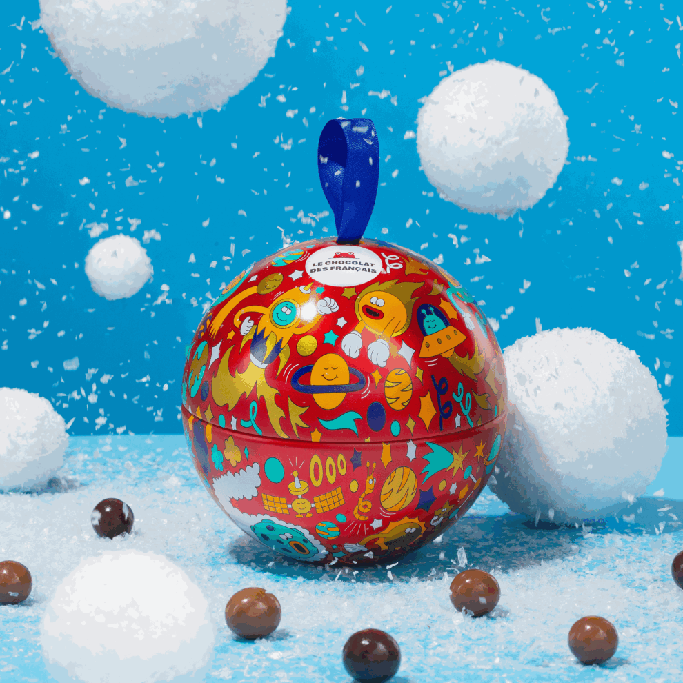 Cette boule de Noël en métal est l’accessoire parfait de votre sapin de Noël. Un écrin cosmique qui renferme de délicieuses billes de céréales craquantes, enrobees de chocolat Noir et Lait.