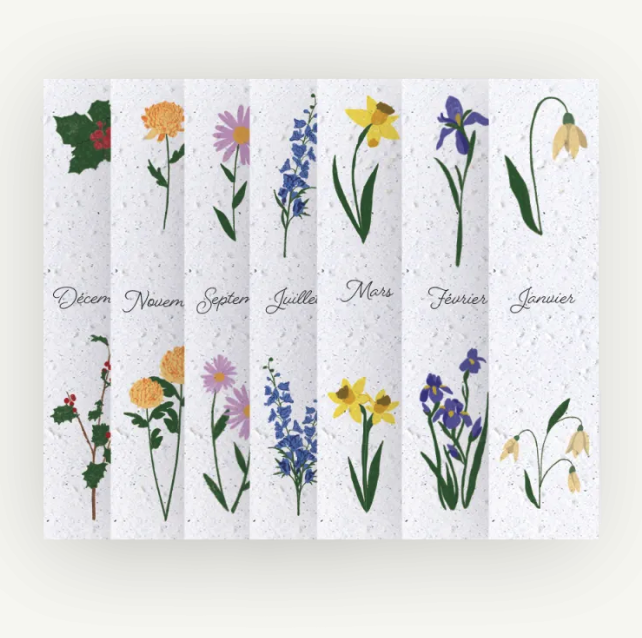 Découvrez nos marque-pages à planter mettant en lumière les fleurs de naissance ! 12 marque-pages calendriers artistiquement illustrés, chacun représentant la fleur associée à chaque mois de naissance, en papier à planter ensemencé de graines de fleurs des champs. Les 12 mois de l’année en fleurs !