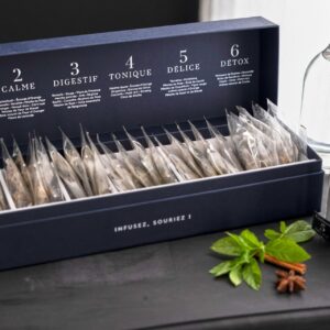 36 sachets de 6 mélanges naturels : Ligne, Calme, Digestif, Tonique, Délices, Détox. Elaboré en France, à déguster à tout moment et sans modération ! Poids Net : 420 g.