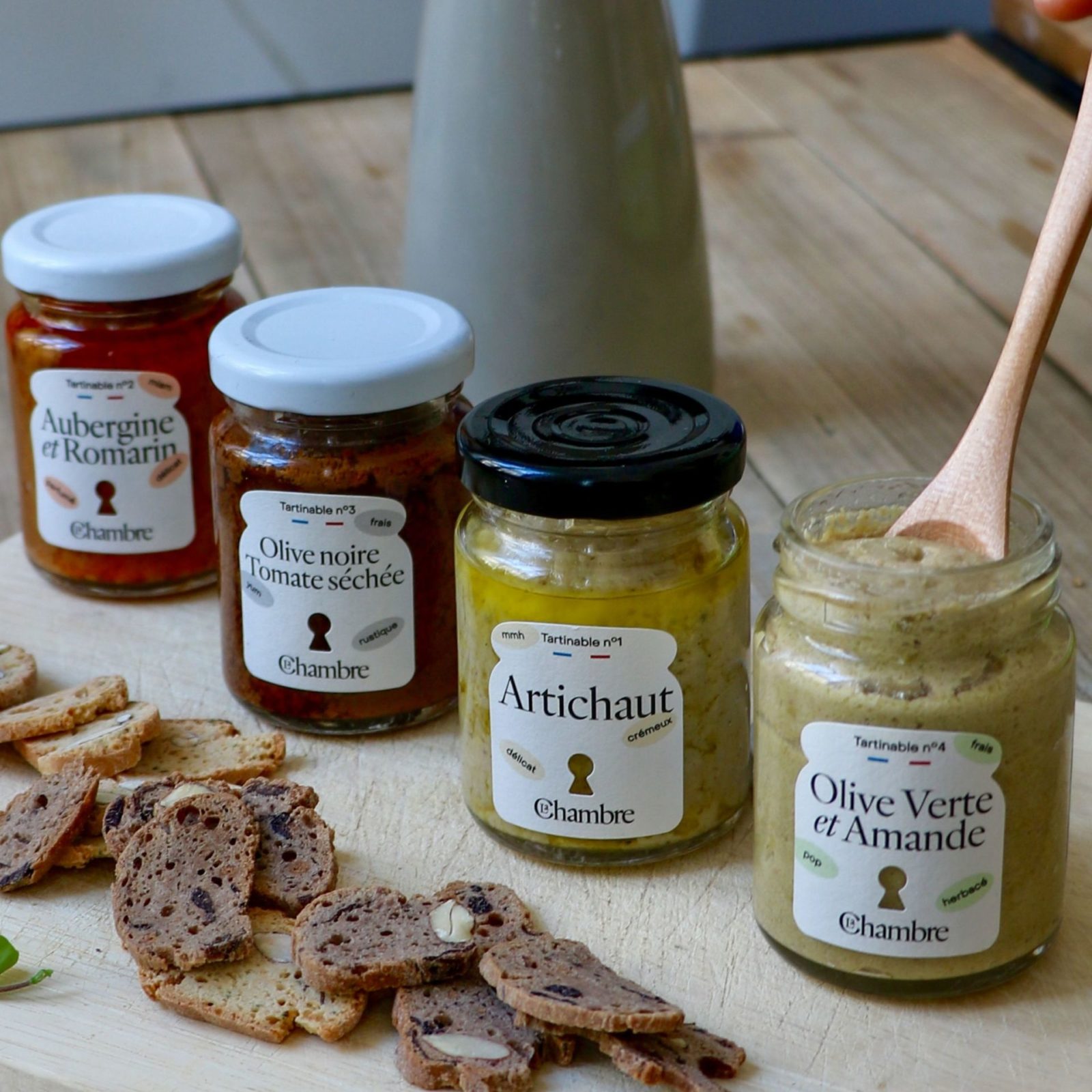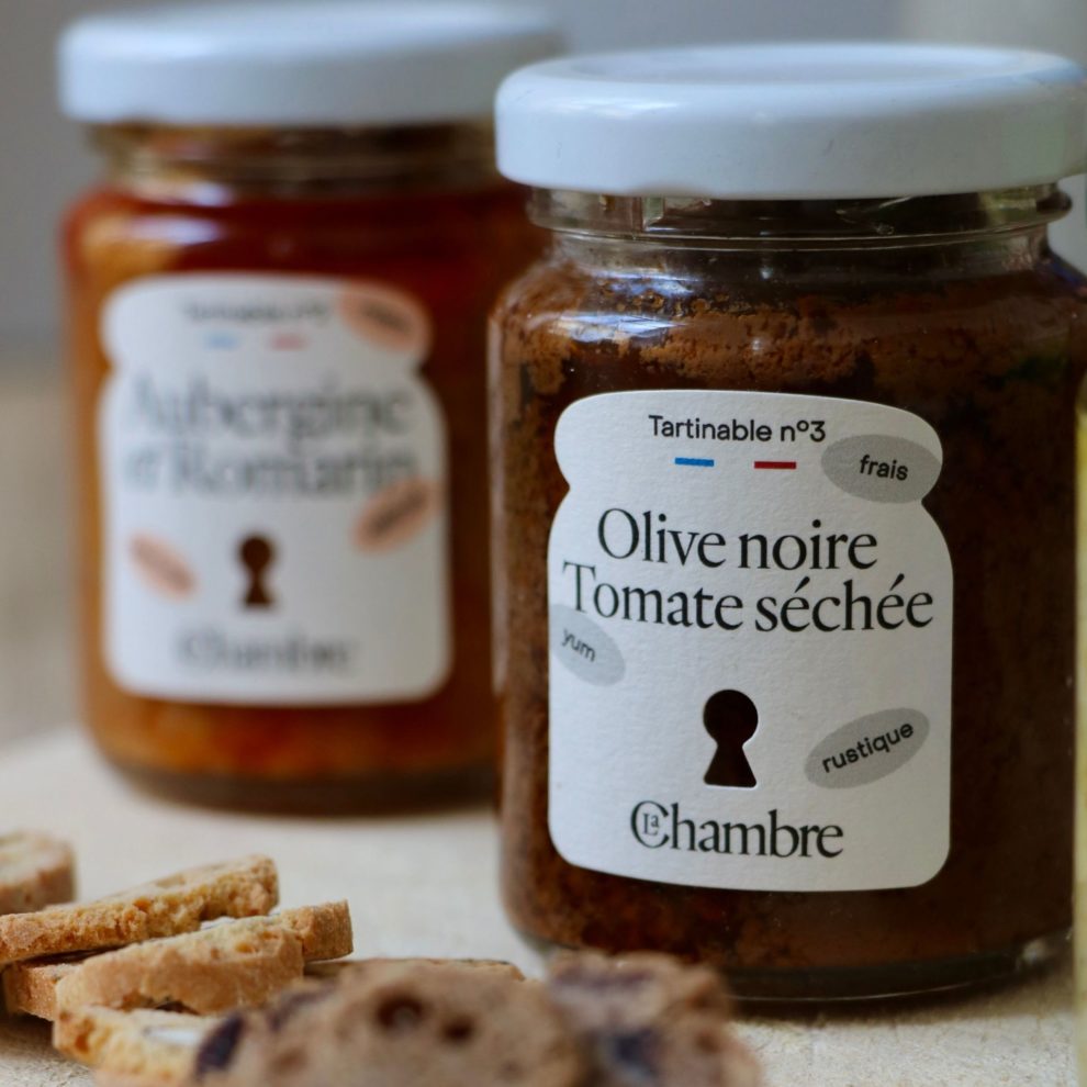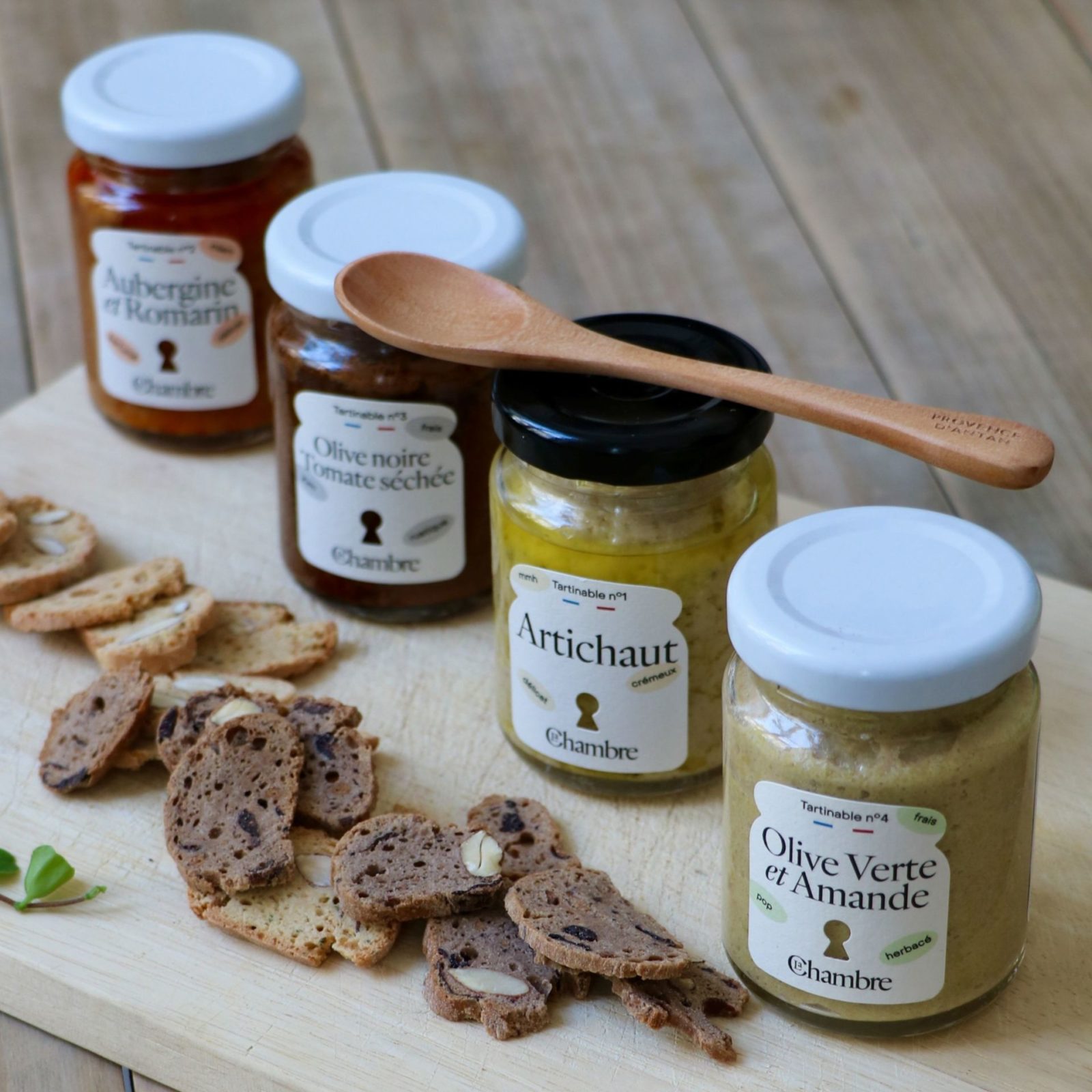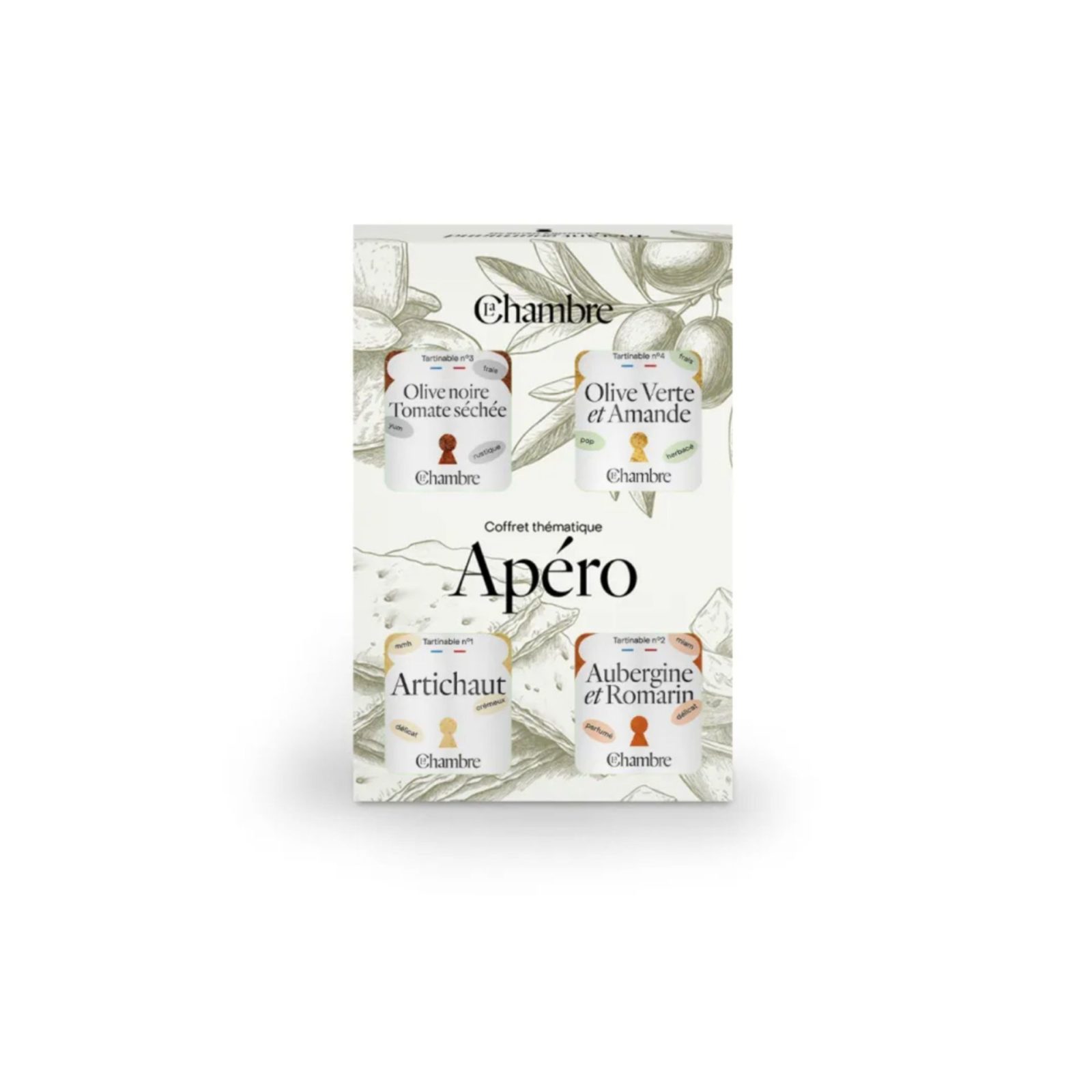 Composition du coffret : tartinade Olive Verte & Amande, tartinade Olive Noire & Tomate Séchée, tartinade Aubergine & Romarin, tartinade Artichaut.
