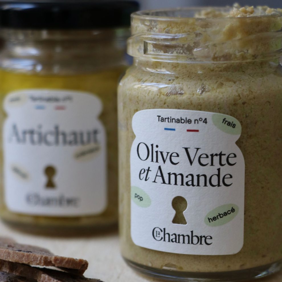 • Tartinade Olive Verte & Amande : Olive verte 49% (olive verte dénoyautées 96%. sel). huile d’olive. amande ( fruits a coques) 15%. citron.